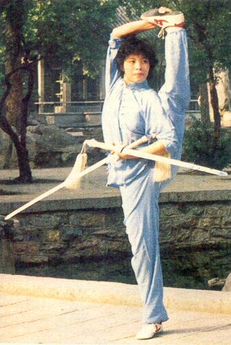 Photo to the left: A woman demonstrating a traditional wushu form. All rights to Wong Kiew.